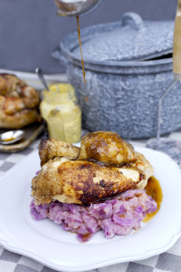 Meestal wordt bij de rode kool een sudderlapje gemaakt. Wij gaan voor de kip. Koop niet een hele grote kip. Want we delen een kip met z’n tweeen. Geen compromissen doen nu, want het is heerlijk om aan zo’n lekkere halve kip te gaan beginnen met de gedachte: ‘helemaal voor mij alleen”