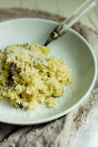 Je gaat door met de bouillon toevoeg en af en toe roeren. En dan ga je proeven. Het korreltje moet beetgaar zijn. Niet te soeperig. En pas op dat je niet teveel bouillon toevoegt want dan wordt het papperig… Is het drogig, dan zit je goed, want voeg dan een lekkere lepel roomboter toe, of wat room en haal de pan van het vuur. Zorg dat je de parmezaanse kaas al geschaafd hebt.